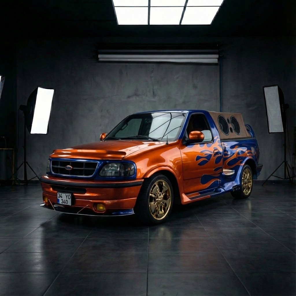 Reklam filmleri hata kabul etmez, detay ister. Opet reklamı için hazırladığımız Ford F-150, tam anlamıyla bir ‘Show Car’ olarak inşa edildi. Aracın karakteristik turuncu rengi üzerine işlenen mavi alev grafikleri, dönemin modifiye kültürünün zirvesini temsil ediyor.